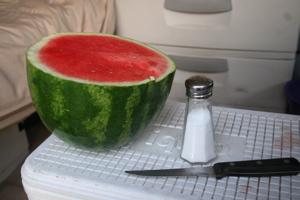 Heat kills even the hardiest appetite. Yet, there’s nothing to take the edge off the heat like a cold chunk of watermelon. So last night I pulled up under a tree and cut into this beauty. Dinner. Sugary sweet, ice cold from my cooler, and dripping with summer.