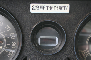 “Are we there yet?” I don’t know. Maybe “there” is not really a place at all, like Never-Never-Land. It’s a place where we dream of, long for, aspire to, but never really find. This is my favorite photo - the tag I have between my speedometer on the van’s dash. I like to write about it a lot because I think about it a lot - “Am I there yet?”