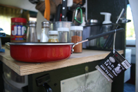 Something as simple as a new red frying pan shouldn’t get me so excited, but it has. Not only will it fit into EVERY drawer in my van, it’s perfect for the kind of cooking I do. I can get a perfect pancake, one fried egg, a pork chop or a hamburger cooked quickly and with less heat than a larger pan. Easy to clean, compact, RED and well made, this is my favorite purchase of the month. There’s a handle with a slot for a carabiner so I can hang it rather than put it in a drawer. It’s enamel - easy to clean, and it’s heavy enough to tolerate the heat of a campfire. It’ll heat quickly on sterno or my alcohol or propane stoves and I can clean it with a paper towel. All for $10 at Bed-Bath-and-Beyond.